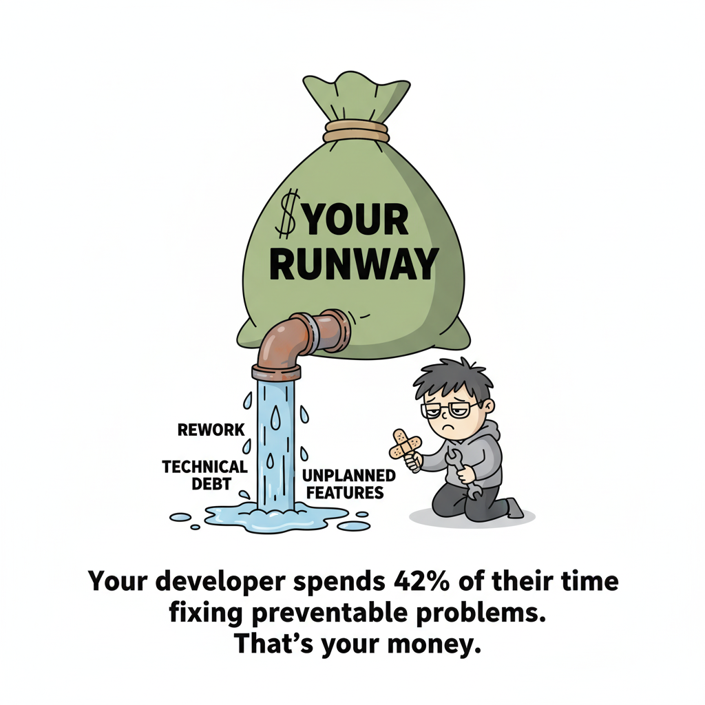 • Financial Pain: Every week you build without a plan, you're lighting money on fire. The average developer wastes over 17 hours a week on technical debt and bad code. For a developer costing $4,000/week, you're flushing over $1,700 down the drain every single week. This is how your 12-month runway shrinks to 6 months before you even have a single user.